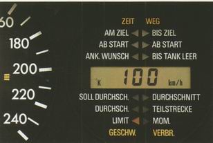 Der Reiserechner versorgt Sie zuverlässig mit 12 wichtigen Informationen über den Fahrbetrieb und die Fahrtstrecke. Die Anzeigeneinheit ist im Kombiinstrument anstelle der Uhr- Drehzahlmesserkombination untergebracht. Die Tastatur zur Programmierung befindet sich in der Mittelkonsole. Ein Teil der Informationen wird ständig ohne Zutun des Fahrers berechnet und ist jederzeit abrufbereit. Für den übrigen Teil ist eine Programmierung durch den Fahrer vor Fahrtantritt erforderlich. So kann Sie beispielsweise der Reiserechner vor Geschwindigkeitsübertretungen warnen, wenn Sie ein vorgeschriebenes Geschwindigkeitslimit einprogrammiert haben. |